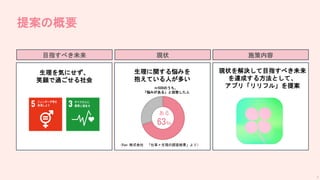 提案 今後の展望 ビジネスモデル Variable 利便型 ストレス型 体調管理型 その使用金額は.高いと思いますか.妥当だ と思いますか.安いと思いますか…1.とても 安い.2.安い.3.妥当.4.高い.5.とても高い. 0.1670896 0.1544083 0.1727683 生理がくることは憂鬱ですか. 0.1105779 0.4596827 0.0135723 学校や職場などの出先で.急に生理が来た 時ストレスや憂鬱さを感じていますか. 0.1063219 0.9778421 0.1658936 生理が来るたびに.ポイント.Vポイントや楽 天ポイント等.が溜まり.そのポイントと商 品を交換できたら嬉しいですか. 0.4457173 0.0267320 0.3156384 個人の症状に合わせた生理用品のサブスク に関してどう思いますか. 0.9842659 0.1190500 -0.1097638 生理周期管理アプリを使ったことがありま すか. 0.0185392 0.0392375 0.4069554 ポイ活アプリ.TikTok.ライトなど.を使った ことがありますか. 0.2918474 0.1382947 0.0783152 利便型 • 個人の症状に合わせた生理用品の サブスク • ポイ活に需要を感じる ストレス型 • 学校や職場で急に生理が来た時の ストレスや憂鬱感 • 生理が来ることへの憂鬱を感じる 生理管理型 • 生理周期管理アプリの利用 • 体調管理に関心がある