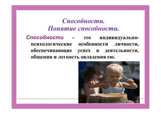 Документ рассматривает понятие способностей как индивидуально-психологических особенностей, влияющих на успешность в деятельности и общении. Описываются различные типы способностей, включая общие и специальные, а также уровни их развития, такие как одаренность и талант. Упоминаются факторы, способствующие развитию способностей, включая сензитивные периоды и эмоциональные переживания.