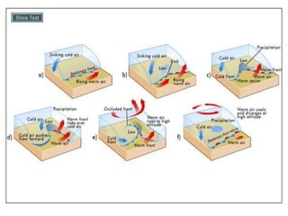 Air masses take on characteristics of the regions where they form and remain stationary. They are classified by temperature and moisture content as either continental, maritime, tropical, or polar. Fronts form boundaries between differing air masses and can cause precipitation. Cold fronts push warm air out of the way while warm fronts lift warm air over colder air. Stationary fronts move slowly and occluded fronts occur when a cold mass overtakes a warm one. Cyclones are low pressure storm systems that rotate counter-clockwise along storm tracks, while anticyclones bring dry weather with sinking air flowing outward clockwise from high pressure centers.