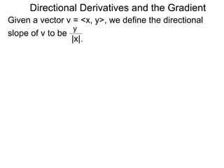 The document discusses directional derivatives and the gradient. It defines the directional slope of a vector v as the ratio of the y-component to the x-component of v. It then gives an example of calculating the directional slopes of several vectors. It explains that the directional slope indicates the steepness and direction of v. For a differentiable function f(x), the directional derivative in the direction of the unit vector <1,0> is the partial derivative df/dx, while the opposite direction has derivative -df/dx.