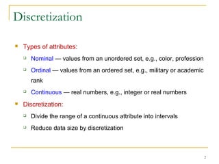 1. Discretization involves dividing the range of continuous attributes into intervals to reduce data size. Concept hierarchy formation recursively groups low-level concepts like numeric values into higher-level concepts like age groups.