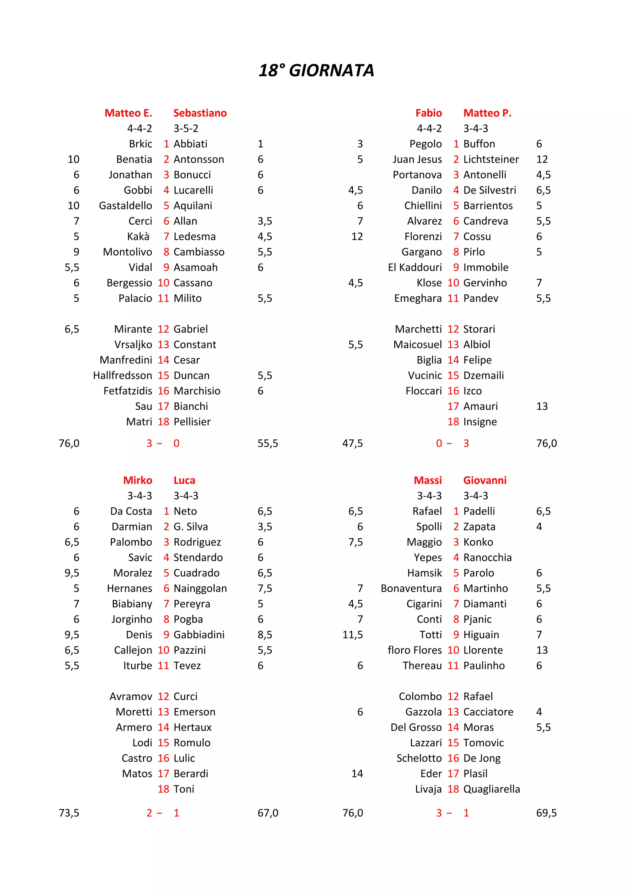 18° GIORNATA 10 6 6 10 7 5 9 5,5 6 5 6,5 76,0 6 6 6,5 6 9,5 5 7 6 9,5 6,5 5,5 Matteo E. 4-4-2 Brkic Benatia Jonathan Gobbi Gastaldello Cerci Kakà Montolivo Vidal Bergessio Palacio 1 2 3 4 5 6 7 8 9 10 11 Sebastiano 3-5-2 Abbiati Antonsson Bonucci Lucarelli Aquilani Allan Ledesma Cambiasso Asamoah Cassano Milito Mirante Vrsaljko Manfredini Hallfredsson Fetfatzidis Sau Matri 12 13 14 15 16 17 18 Gabriel Constant Cesar Duncan Marchisio Bianchi Pellisier 3−