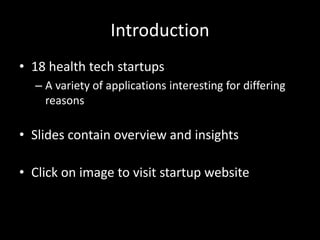 The document highlights 18 innovative health technology startups, each offering unique solutions aimed at improving healthcare delivery and patient engagement. Startups include CellScope for remote ear infection checks, Zipnosis for online diagnostics, and Propeller Health for inhaler monitoring, among others. The diversity of these technologies reflects a growing trend in telemedicine, wearable health devices, and patient-centric care models.