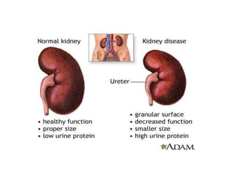 The document summarizes kidney function and chronic kidney disease. It discusses how the kidneys filter waste from the blood and produce important hormones. Chronic kidney disease is a progressive loss of renal function over time that can be caused by conditions like diabetes or hypertension. Symptoms of worsening kidney function are nonspecific but may include fatigue. Dialysis is needed when the kidneys fail completely, which works to remove waste but cannot replace all kidney functions.