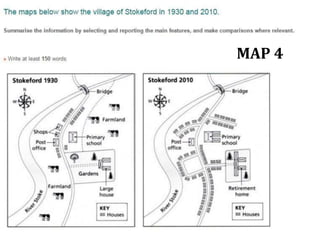 The document provides a series of maps showing current and planned changes in various towns including Islip, Borrowmeade, Sheldon, Meadowside Village, Fonton, Riverage College, Spanish City Castéllon, and Hunderstone. It highlights developments from different time periods, specifically noting changes from recent times up until 2025 or 2030. The instruction is to summarize and compare the main features evident in these maps.