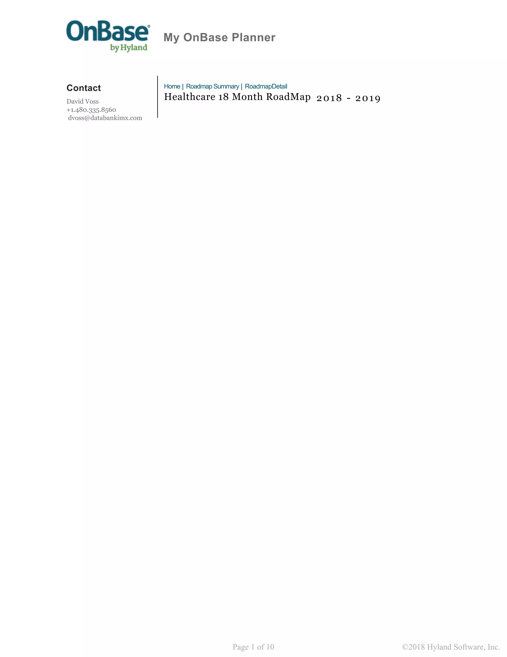 This 18-month roadmap outlines the OnBase solutions that will be released each quarter to support various healthcare processes. Key solutions included are Release of Information, Paperless Patient Registration, Deficiency Management, Medical Records Management, Computer Assisted Coding Integration, and more. The roadmap covers solutions for clinical documentation, revenue cycle management, records management, and other areas.
