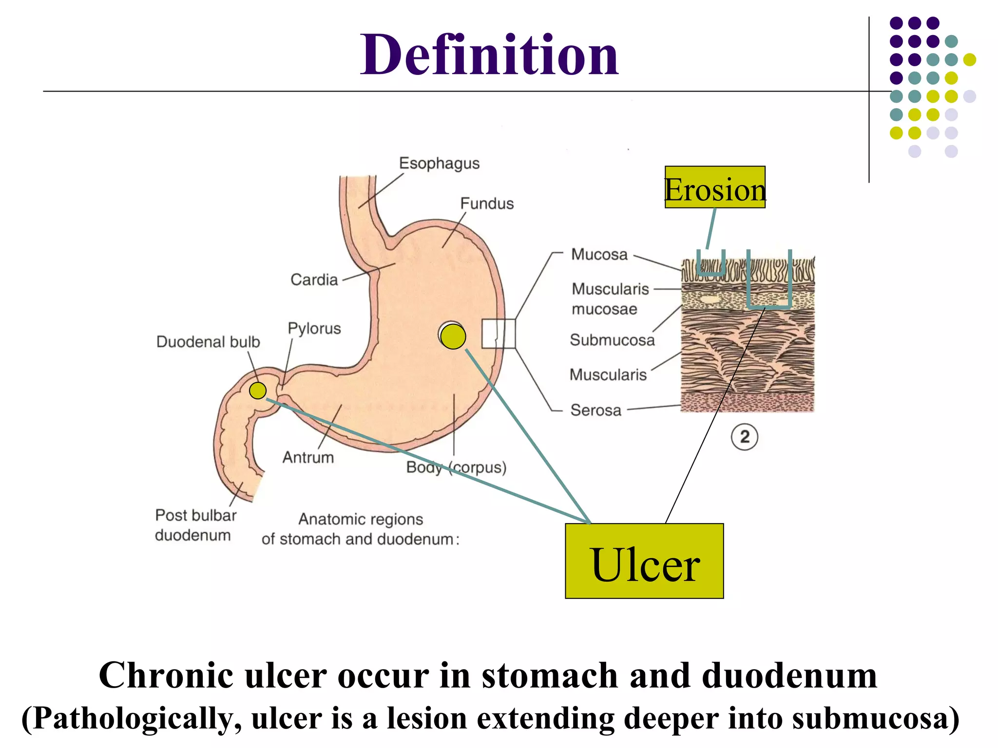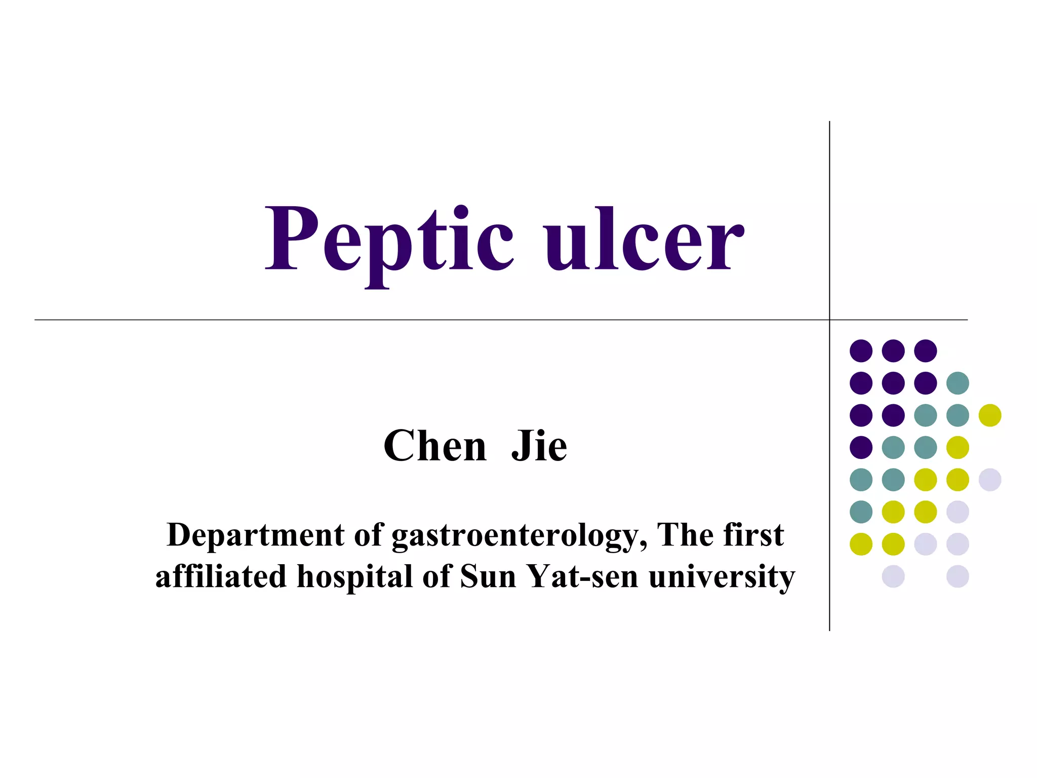 Peptic ulcer disease is caused by Helicobacter pylori (Hp) infection and nonsteroidal anti-inflammatory drug (NSAID) use. Definitive diagnosis is by endoscopy, which can detect ulcers and test for Hp. Common complications are bleeding, perforation, and pyloric obstruction. Treatment involves eradicating Hp, relieving symptoms with anti-ulcer drugs, and preventing recurrence with long-term proton pump inhibitor use.