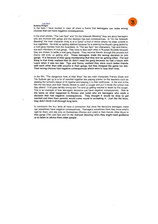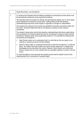 The document provides an exemplar student response for an internal assessment on explaining significant connections across texts using supporting evidence. It analyzes the response based on the achievement standard and provides commentary and examples to demonstrate the grade boundary criteria for Excellence, Merit, Achieved, and Not Achieved. The exemplar aims to support teachers in understanding what is required to meet the standard and how responses can be improved.