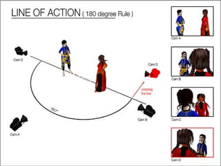 The 180-degree rule states that the camera should remain on the same side of an imaginary line drawn between characters during a scene to maintain spatial continuity. Breaking this rule can confuse audiences as it disorients their understanding of where characters are in relation to each other. Continuity editing aims to smoothly transition between shots through techniques like matching actions, diegetic sound, and establishing shots to logically connect scenes and prevent viewer disorientation. Common techniques include ellipses to imply breaks in time, diegetic sound to overlap shots, and matching actions to maintain temporal continuity across cuts.