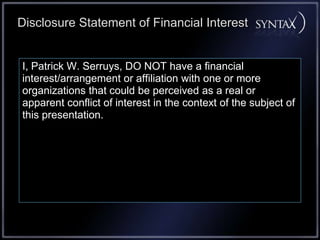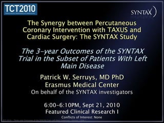 The document summarizes the 3-year outcomes of the SYNTAX clinical trial for patients with left main coronary artery disease. The SYNTAX trial randomized patients with complex coronary artery disease to either coronary artery bypass grafting (CABG) or percutaneous coronary intervention with paclitaxel-eluting stents (PCI). For the 705 patients in the left main subgroup, the rates of all-cause death at 3 years were similar between CABG (8.4%) and PCI (7.3%). However, the rate of stroke was significantly higher in the CABG group (4.0%) compared to the PCI group (1.2%).