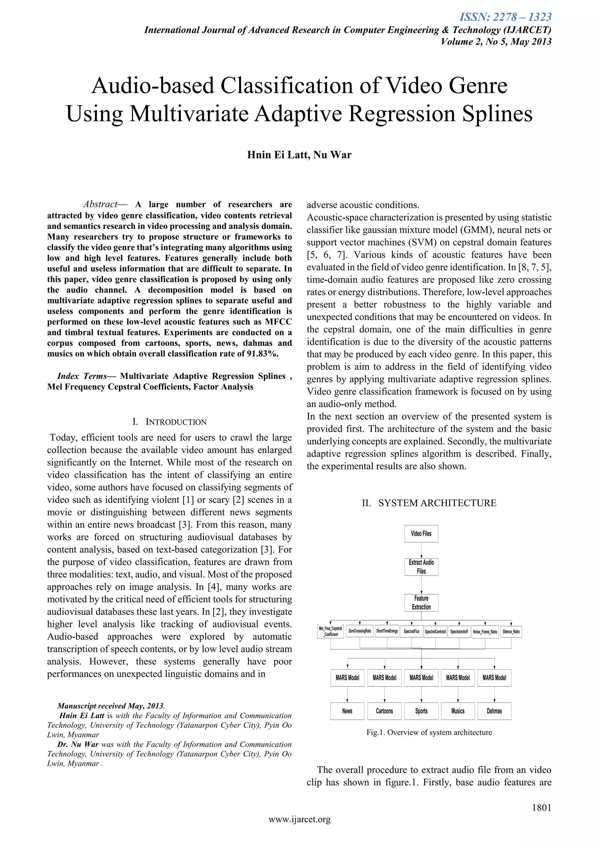This document proposes a video genre classification method using only audio features extracted from video clips. It uses Multivariate Adaptive Regression Splines (MARS) to build classification models for different genres based on low-level audio features like MFCCs, zero crossing rate, short-time energy, etc. extracted from a dataset of news, cartoons, sports, music and dahmas video clips. The models are able to accurately classify video genres with an overall classification rate of 91.83% based on the important audio features identified for each genre by the MARS models.