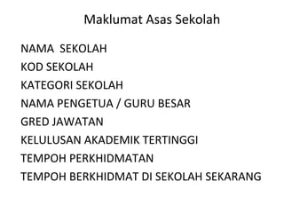 Dokumen ini adalah pembentangan sekolah untuk program pengarah turun padang 2013 yang menyenaraikan maklumat asas sekolah dan pencapaian. Ia merangkumi sasaran prestasi akademik dan kokurikulum untuk tahun 2013-2015, termasuk strategi untuk penambahbaikan dan isu pengurusan. Penutup dokumen mengandungi harapan pengetua serta tag line jika ada.