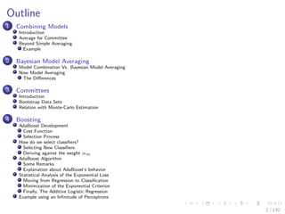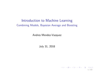The document provides an introduction to machine learning techniques involving model combinations, Bayesian model averaging, and boosting. It discusses the benefits of combining multiple classifiers, including through committees and sequential training, and differentiates between various averaging methods. Furthermore, it outlines the workings of algorithms like AdaBoost and the relation between decision trees and model predictions.