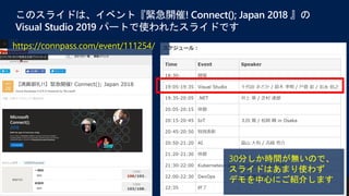 Microsoft Connect 2018 Japan ( https://connpass.com/event/111254/ ) の Visual Studio 2019 セッションのスライドです。デモ中心なのでアジェンダだけですが