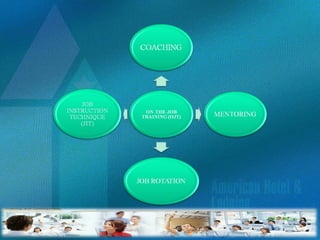 The document discusses various training methods, including on-the-job training, coaching, mentoring, job rotation, job instruction technique, and off-the-job training such as sensitivity training, transactional analysis, lectures, and games/simulations. On-the-job training involves less experienced employees learning from more experienced colleagues, coaches provide one-on-one feedback and guidance, and mentoring focuses on developing attitudes for management-level employees. Other methods like job rotation, instruction techniques, and off-the-job activities help broaden skills in different areas.