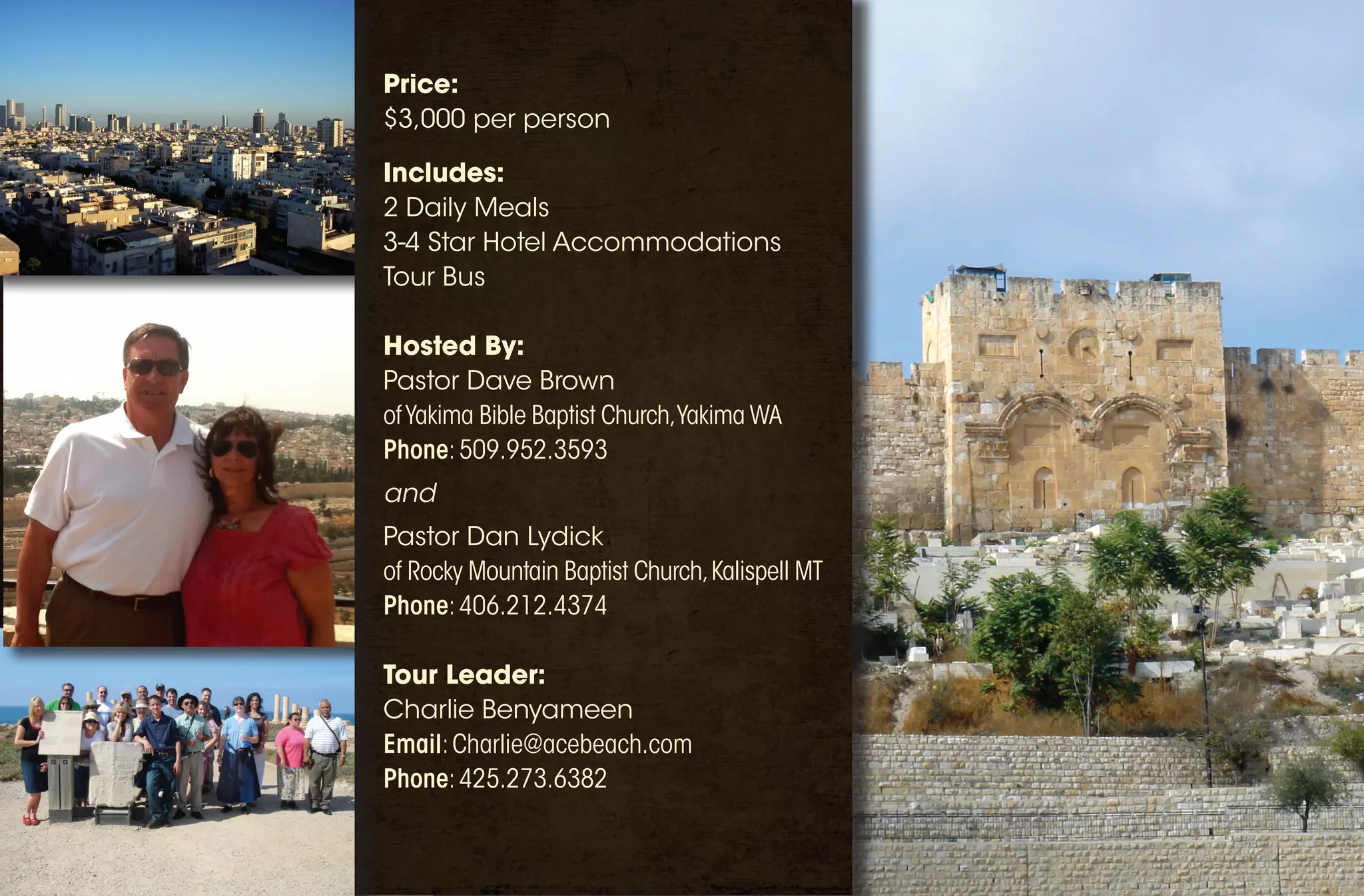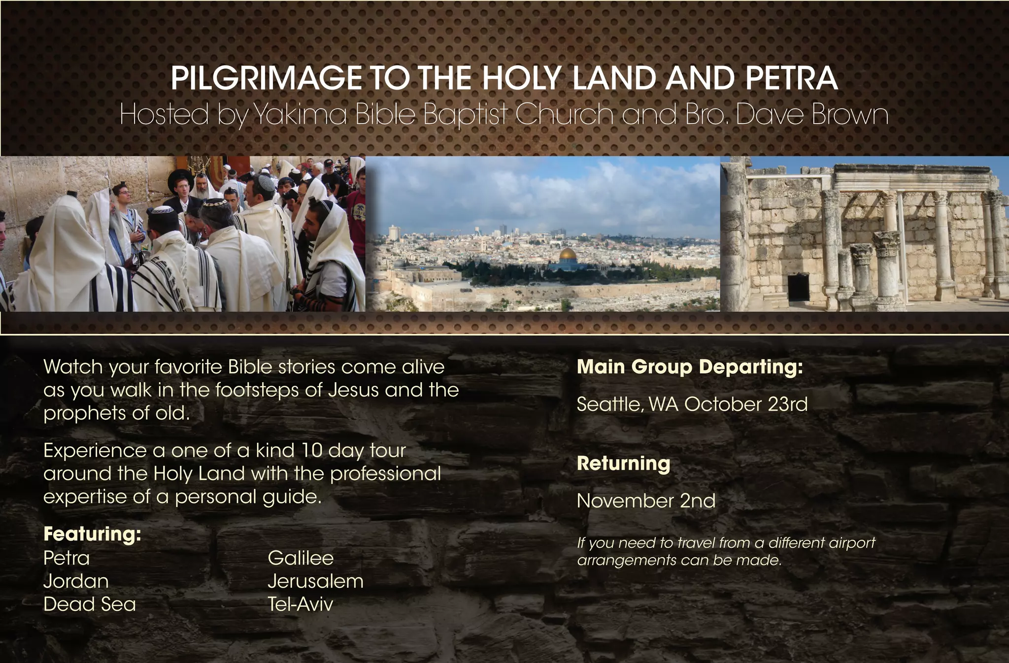 A 10-day pilgrimage tour of the Holy Land and Petra hosted by Yakima Bible Baptist Church will take place from October 23rd to November 2nd. The tour will be led by professional guide Charlie Benyameen and will include visits to main sites like Petra, the Dead Sea, Galilee, and Jerusalem for $3,000 per person, including most meals and 3-4 star hotel accommodations. Interested participants can contact Pastor Dave Brown or Pastor Dan Lydick for more information.