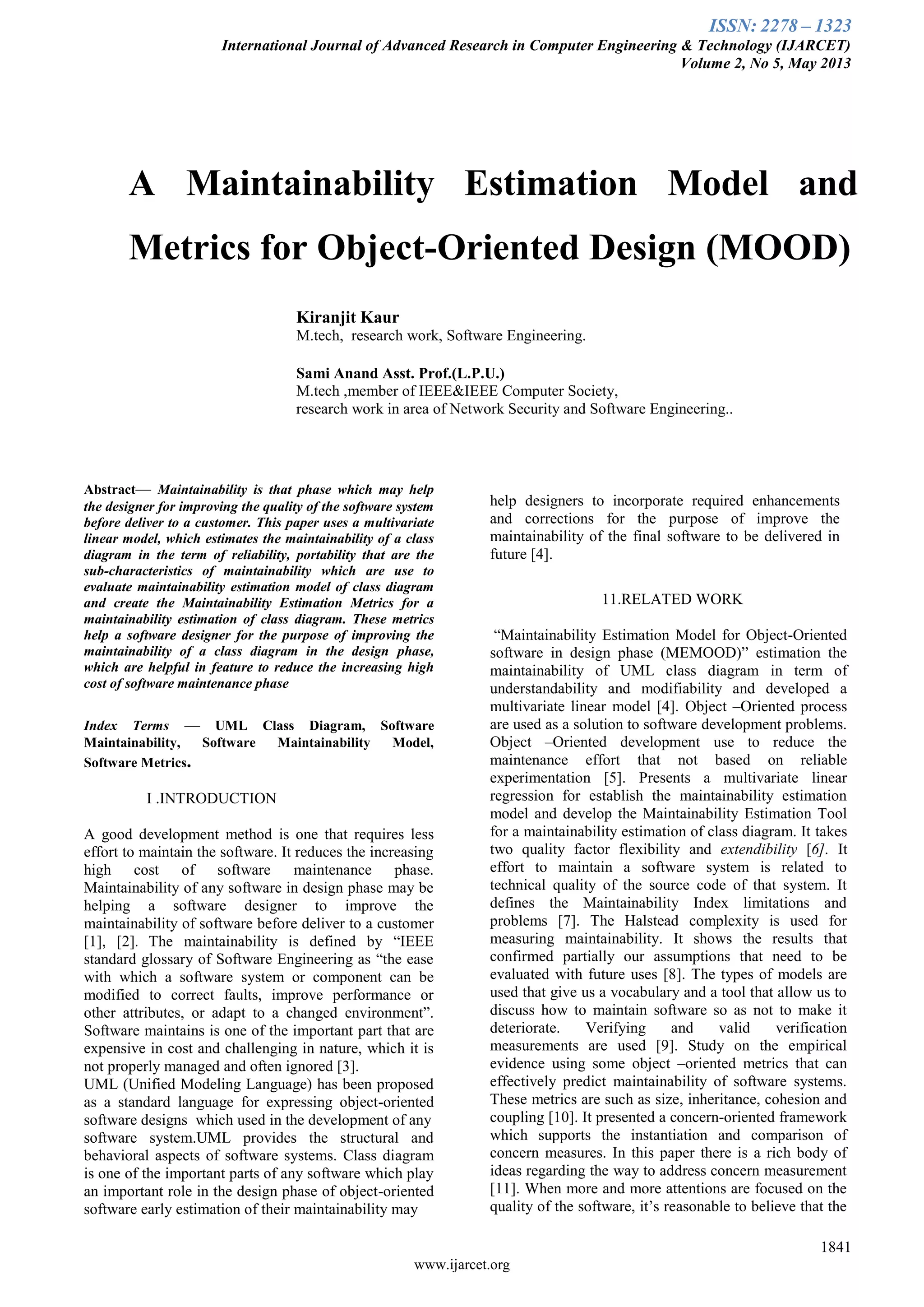 This document proposes developing an extended maintainability estimation model for object-oriented software designs that incorporates reliability and portability metrics. It begins by introducing maintainability and discussing how estimating maintainability during design can help reduce maintenance costs. It then reviews related work on maintainability models and metrics. The proposed work section outlines developing a model that calculates maintainability based on reliability and portability factors. It defines the key aspects of reliability and portability and describes a methodology for inheriting these factors into an existing maintainability model called MOOD. The methodology would use a MATLAB GUI to demonstrate how replacing buggy components with reliable, portable ones could lower maintenance costs.