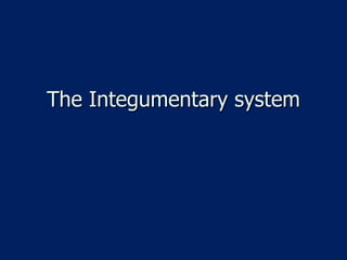 The document summarizes the structure and function of the integumentary system. It describes the two main layers of the skin - the epidermis and dermis - as well as various cell types found in the epidermis like keratinocytes, melanocytes, and Langerhans cells. It also discusses skin appendages such as hair follicles, sebaceous glands, and sweat glands. The summary concludes by noting the integumentary system acts as a protective barrier and regulates temperature and moisture.