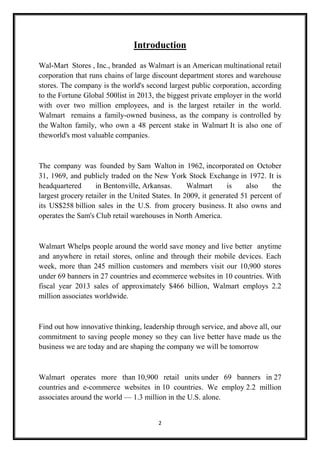 Walmart is the largest retailer in the world, operating over 10,900 retail units globally. It was founded by Sam Walton in 1962 and is headquartered in Bentonville, Arkansas. Walmart employs over 2.2 million associates worldwide and generated over $466 billion in sales in 2013. The company focuses on saving people money through everyday low prices. It has expanded its offerings to include services like health clinics, money transfers, and high-speed internet access. Walmart aims to better serve its core customer base and strengthen its brand through these service expansions.