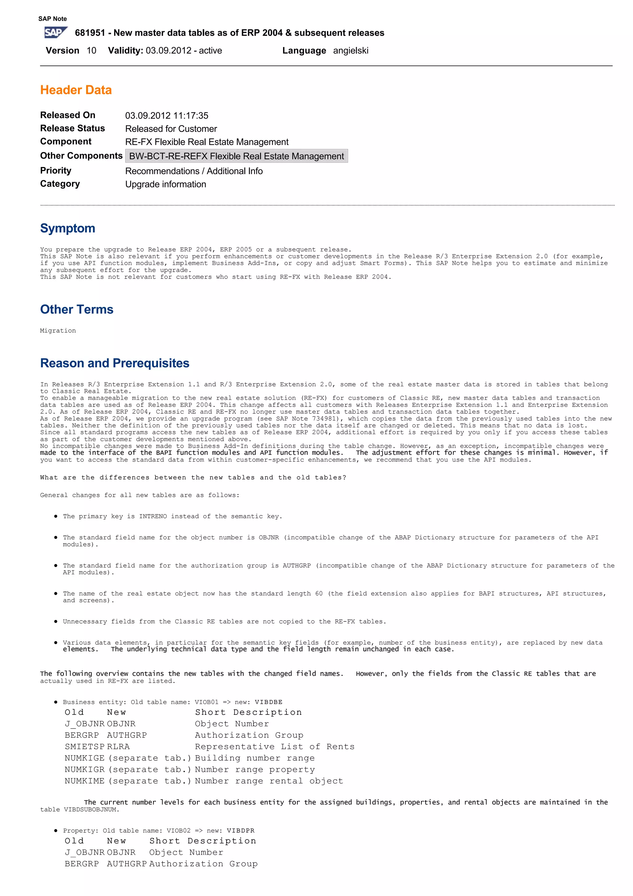 This SAP note provides guidance for customers upgrading to SAP ERP 2004 or later releases from earlier releases of SAP RE-FX. It details changes made to real estate master data tables and describes how to update any customer code that may be impacted. Key changes include new table names and field names. The note recommends using API/BAPI functions rather than direct table access and provides specifics on updating reports, forms, and interface changes.