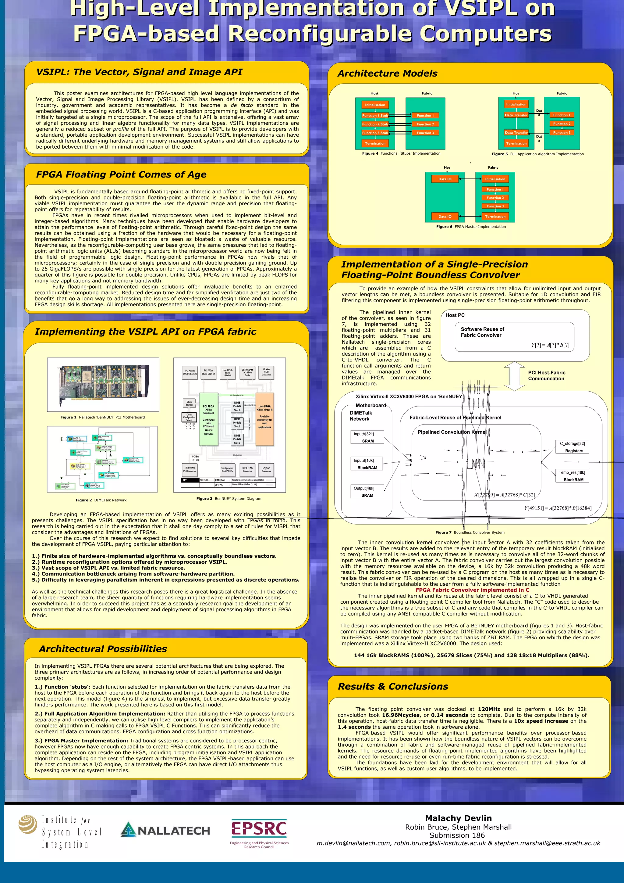 The document discusses implementing the Vector, Signal and Image Processing Library (VSIPL) on FPGA-based reconfigurable computers. It examines the challenges of doing so given VSIPL's boundless vectors and extensive scope. It presents an implementation of a single-precision floating-point boundless convolver as a proof of concept. The convolver achieved a 10x speed increase over software. Three potential architectures for broader FPGA VSIPL implementations are outlined.