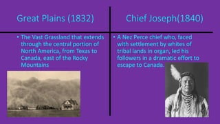 This document provides a timeline of key events between 1865 and 1895 in the United States. It describes the expansion of the cattle industry in Texas and the drives of cattle to markets, conflicts between Native American tribes and white settlers over land, the gold rush in the Black Hills and its effects, the Ghost Dance movement among Native Americans, and the Wounded Knee Massacre in 1890. It also discusses immigration to the US through Ellis Island and Angel Island on the West Coast, the growth of cities and urban poverty, and prominent inventors and innovators like Edison, Bell, and Bessemer during this period.
