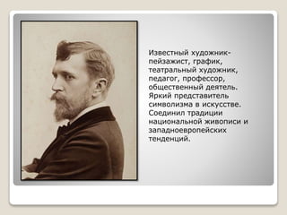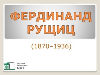 Фердинанд Рущиц (1870-1936) был известным белорусским художником, пейзажистом и педагогом, представляющим символизм в искусстве. Он объединил традиции национальной живописи с западноевропейскими тенденциями и стал ведущим представителем 'нового русского пейзажа'. После успешной карьеры и влияния на архитектуру и искусство, он оставил заметное наследие, которое включало работы, выставленные в музеях Польши, Литвы и России.
