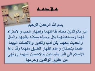 تناقش الوثيقة أهمية البر بالوالدين كطاعة واحترام لهما، مع تقديم نصائح حول كيفية إظهار الحب لهما. كما تشدد على فوائد بر الوالدين مثل المحبة من الله والبركة في الرزق وطول العمر. في المقابل، توضح الوثيقة الأشكال المختلفة لعقوق الوالدين وأثرها السلبي.