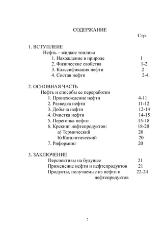 Документ представляет собой реферат о нефти и способах ее переработки, охватывающий такие темы, как происхождение, физические и химические свойства, а также методы переработки. Также затрагиваются исторические аспекты изучения нефти, включая работы таких ученых, как Д. И. Менделеев и М. В. Ломоносов. Основное внимание уделяется классификации нефти и ее составу в зависимости от месторождений.