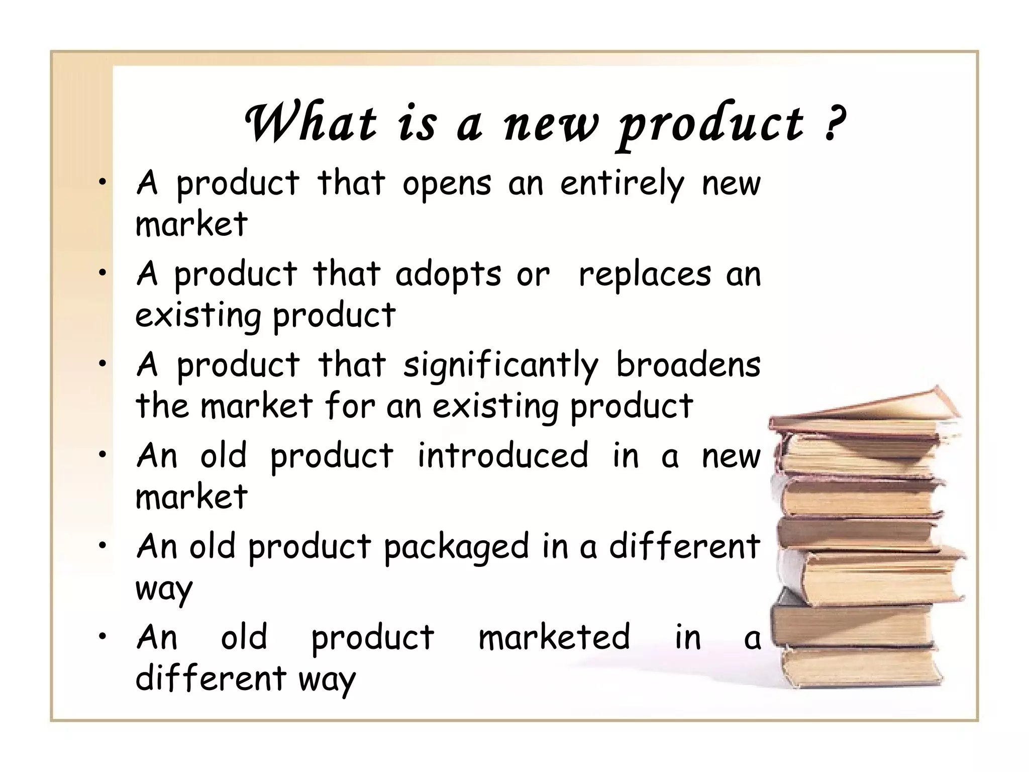 This document discusses new product development. It defines a new product and lists types of new products. The stages of new product development are outlined, including idea generation, screening, concept development/testing, market strategy development, business analysis, test marketing, and commercialization. New products are developed to create future revenue, replace declining products, take advantage of new technologies, and maintain competitive advantage. The key to success is having the right operating philosophy, organization structure, experience, and management style.