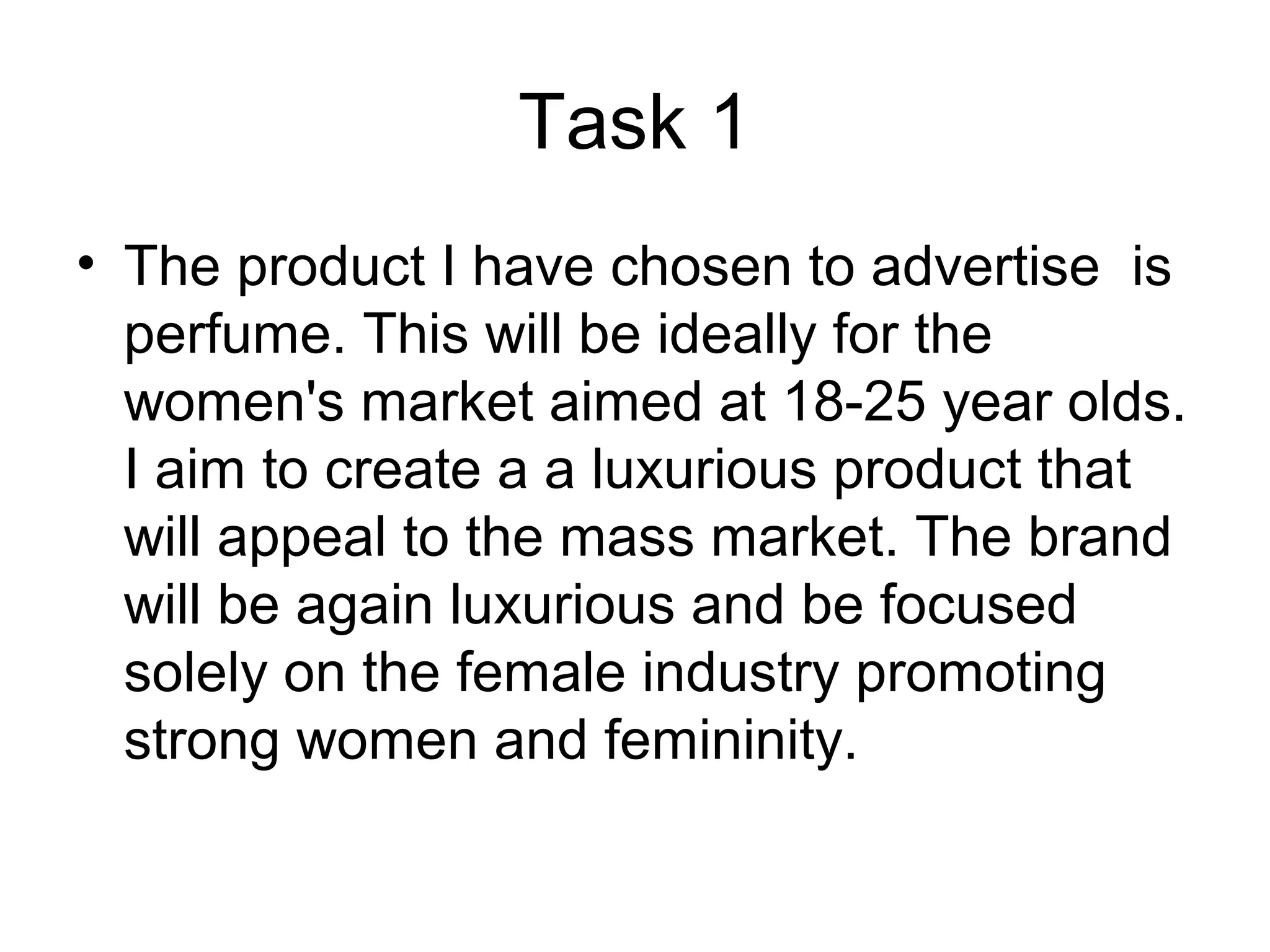 The document discusses advertising a perfume product aimed at women aged 18-25. The goal is to create a luxurious perfume that appeals to the mass market. The brand will project a luxurious image focused solely on empowering women and promoting femininity.