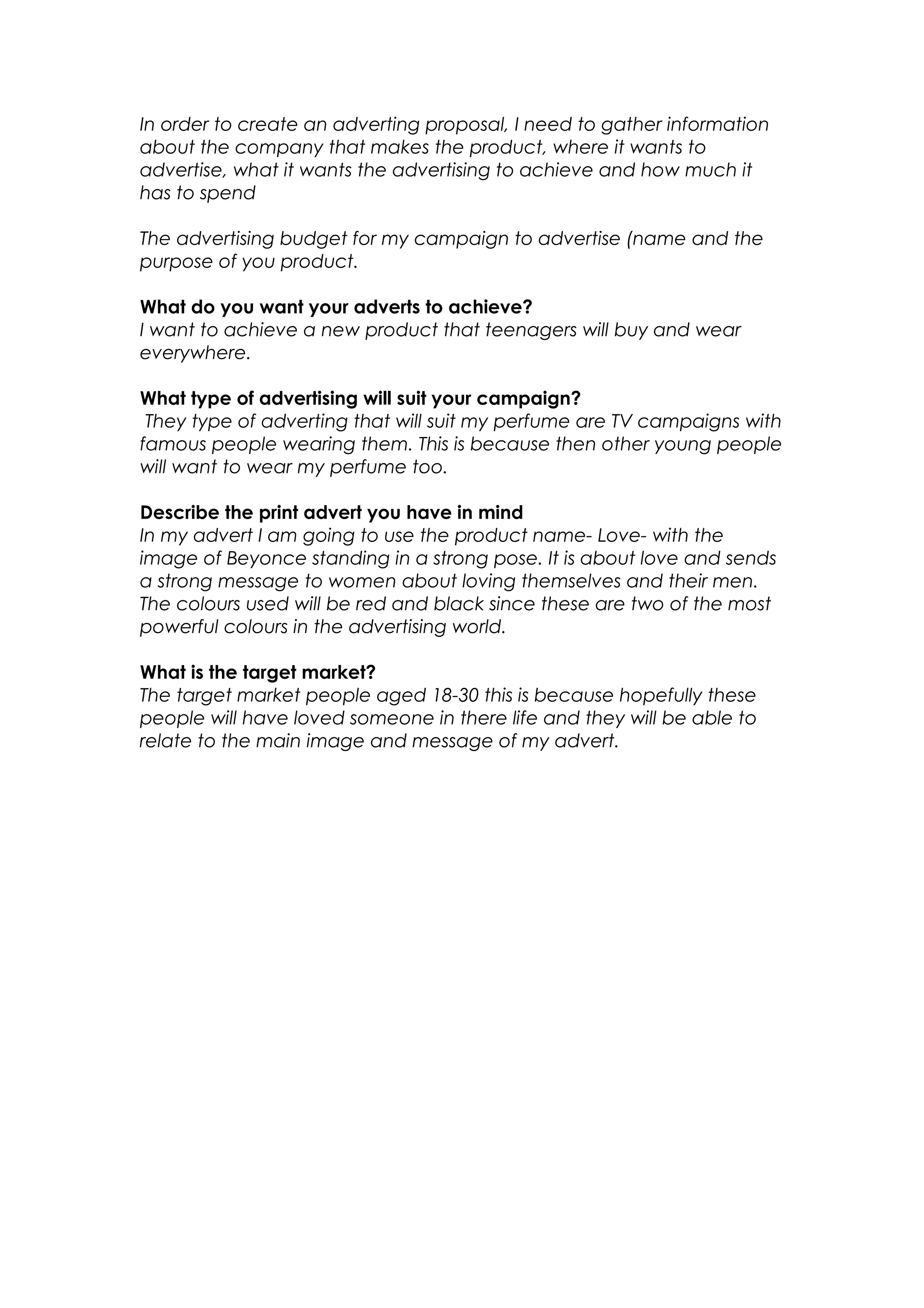 To create an advertising proposal, information is needed about the company, desired advertising locations and budget. The proposal is for a perfume aimed at teenagers to be worn everywhere. Television campaigns featuring famous people wearing the perfume are proposed to influence young people. The print ad would feature Beyonce with the perfume name "Love" in red and black colors, sending messages of self-love and love for others to women aged 18-30, the target market.