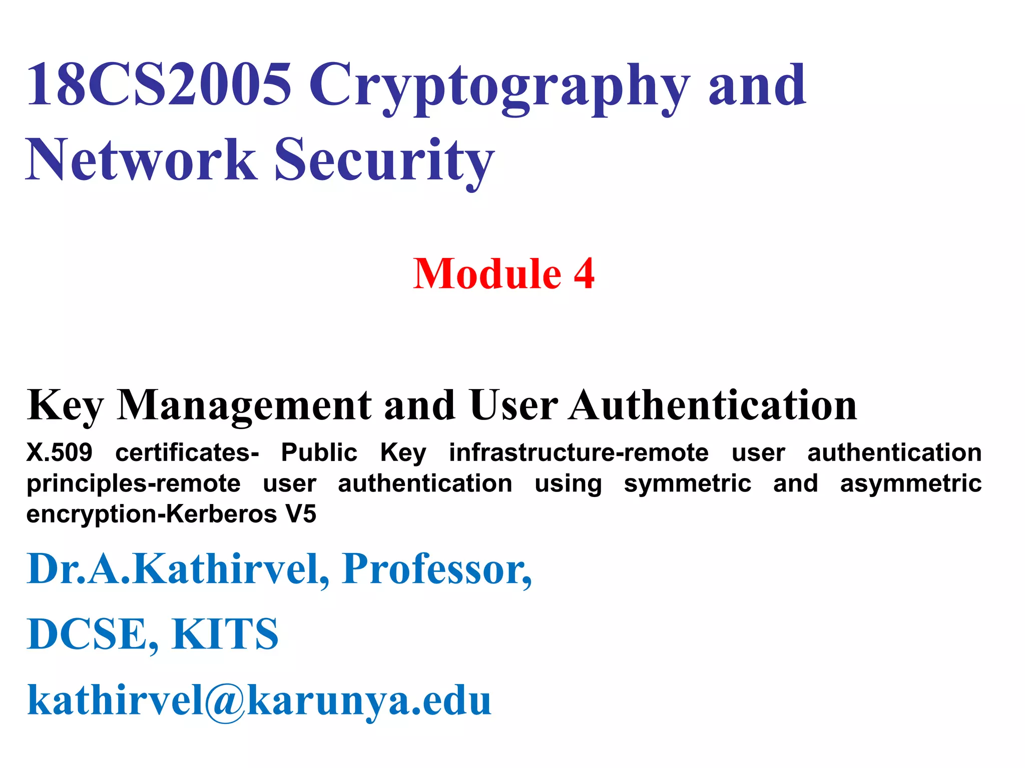 It describes how X.509 certificates contain a user's public key and identification information that is digitally signed by a certification authority. Certification authorities issue and manage certificates according to PKI organization models like strict hierarchies and cross-certification. Certificate revocation lists are used to invalidate compromised certificates. The document outlines authentication protocols using digital signatures and discusses extensions that provide additional certificate information.