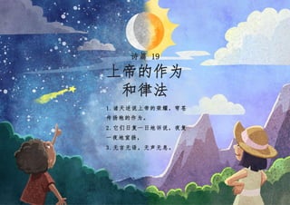 诗篇 19 上帝的作为 和律法 1.诸天述说上帝的荣耀,穹苍 传扬祂的作为。 2.它们日复一日地诉说,夜复 一夜地宣扬, 3.无言无语,无声无息。