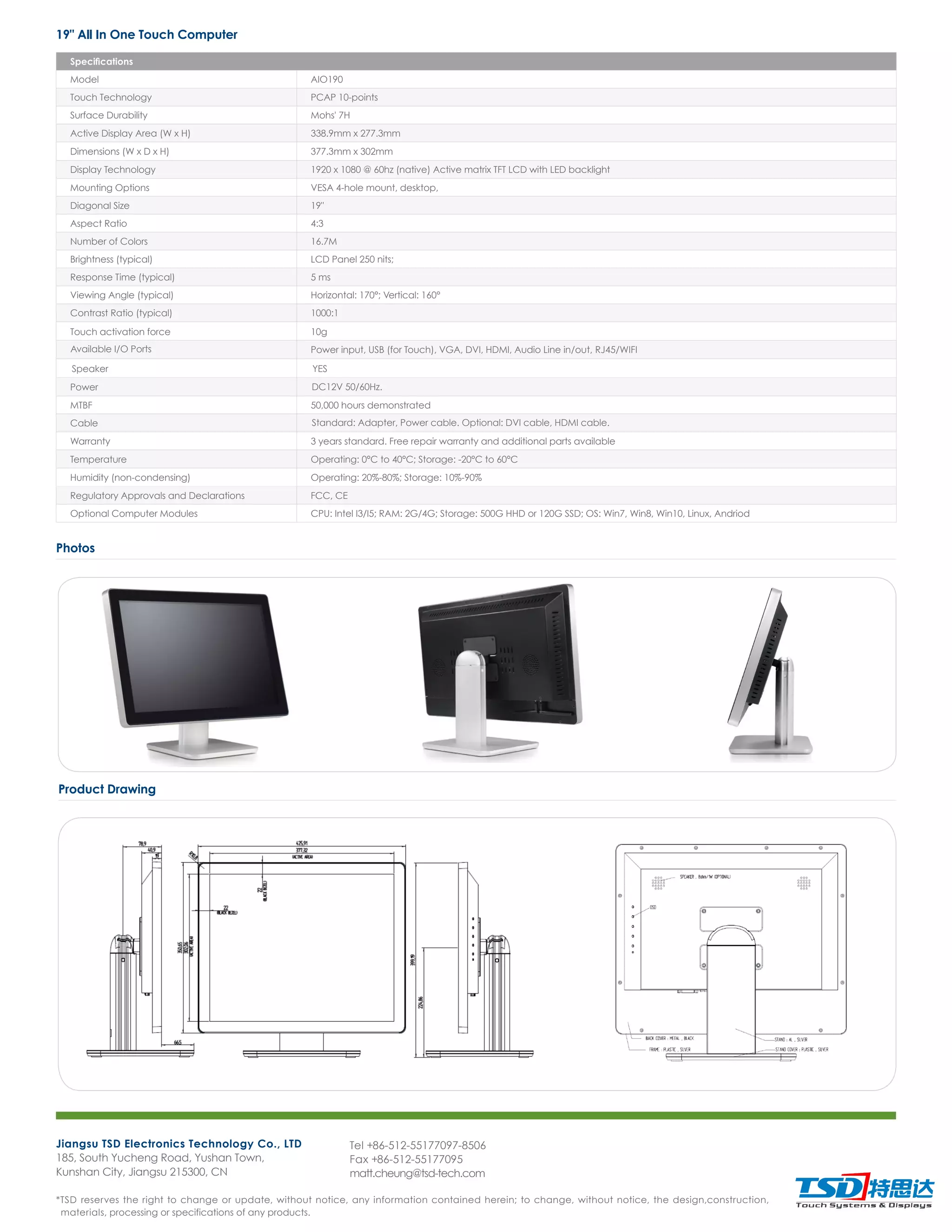 The document provides specifications for the AIO190 touch computer by Jiangsu TSD Electronics Technology Co., Ltd, detailing features such as a 19" display, 1920 x 1080 resolution, and multiple input/output ports. It outlines performance metrics including brightness, response time, and viewing angles, as well as operating conditions and regulatory approvals. Optional computer modules are available, and the product includes a standard three-year warranty.