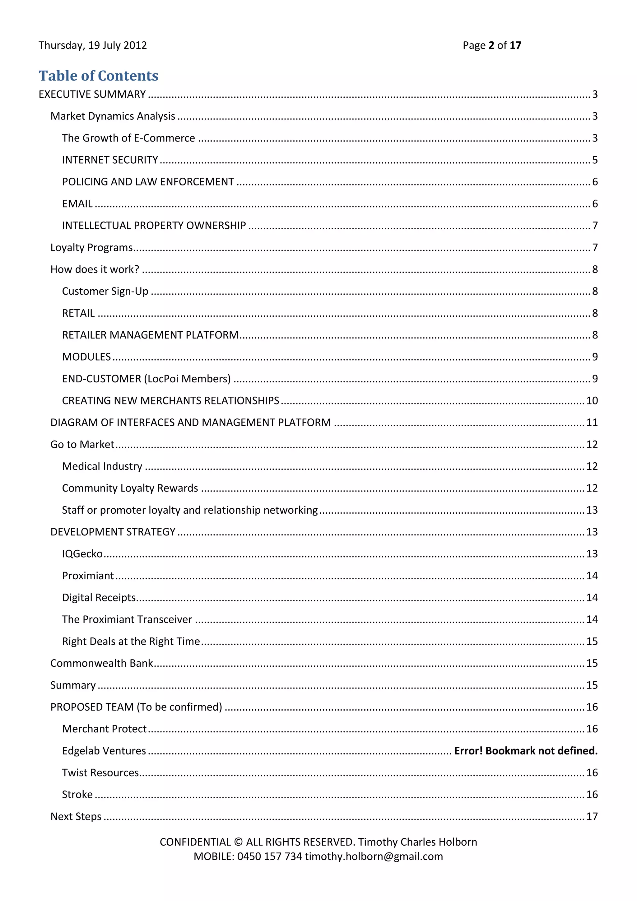 This document provides an overview of a proposed loyalty card and authentication platform called LocPoi. The platform would use physical point of sale access points and customer cards to enable a secure authentication method between individuals and retailers. It analyzes the growth of e-commerce and issues with internet security. It then describes how the proposed loyalty program would work, including customer sign-up, a retailer management platform, and modules. Diagrams show the interfaces and management platform. Potential markets like medical, community rewards, and staff networking are identified. The development strategy and potential partners are outlined. Next steps are to confirm the proposed team and move forward.