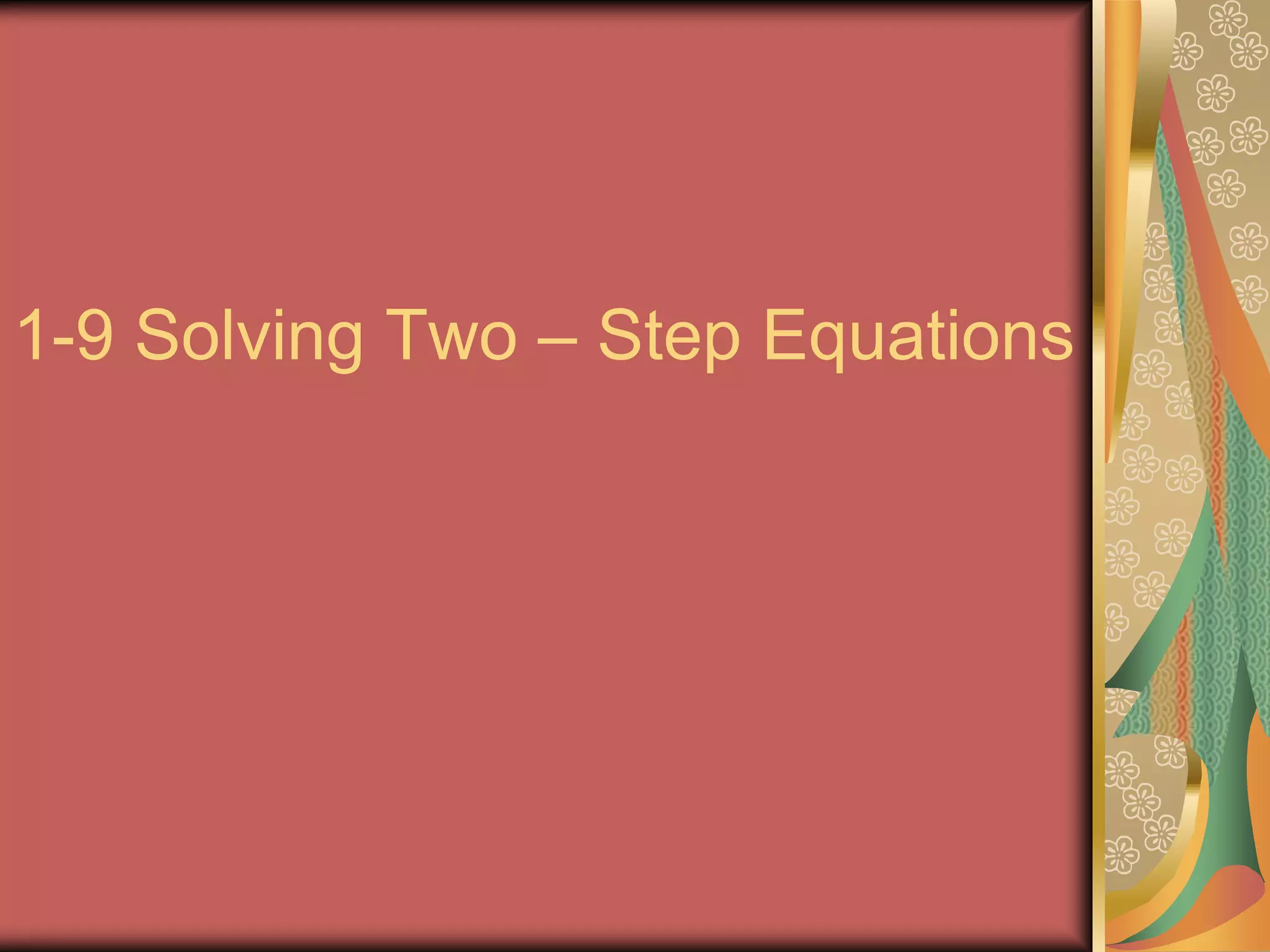 This document contains examples of solving multi-step equations through addition, subtraction, multiplication, and division. It provides 5 warm up problems involving equations with variables, then explains the steps to solve two-step equations by translating words to math, and using operations to isolate the variable. Examples are given showing division and multiplication used to solve equations with more than one operation.