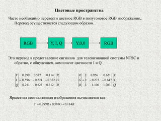 Документ описывает различные цветовые пространства, включая RGB, CMYK, HSB и LAB, с акцентом на их применение и особенности. RGB является аддитивной моделью, используемой для экранов, тогда как CMYK - субтрактивная модель для печати. HSB и LAB предложены для удобного анализа цвета и универсального соответствия соответственно.