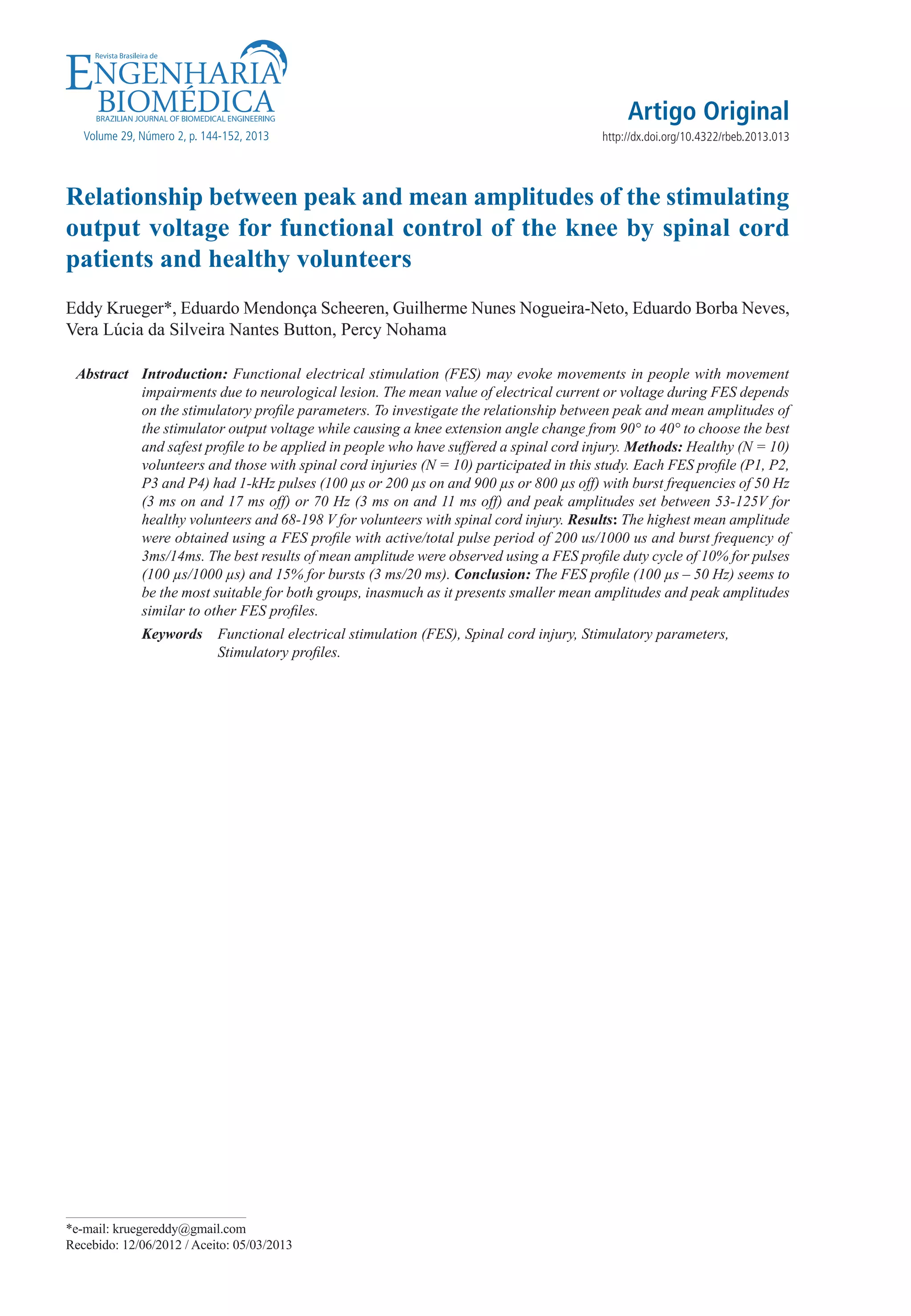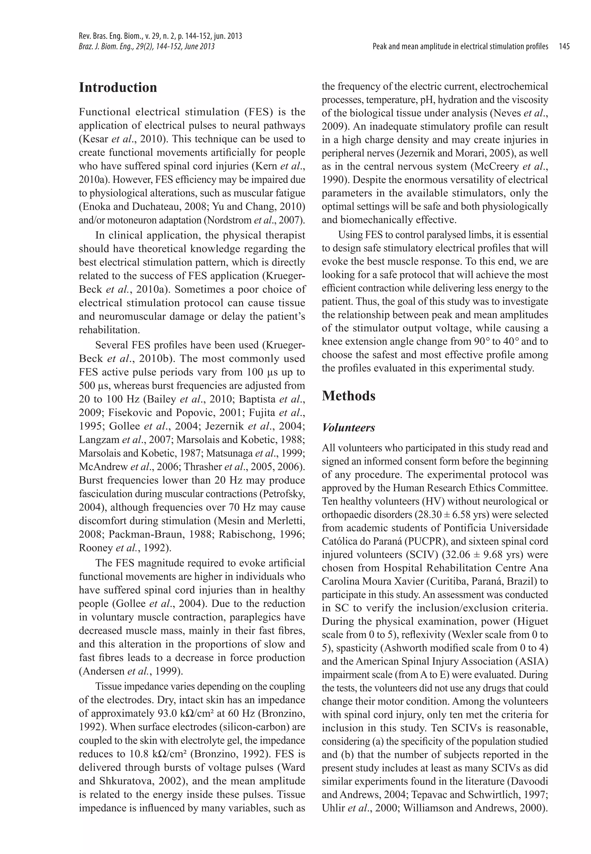 The document describes a study that investigated the relationship between peak and mean amplitudes of stimulator output voltage during functional electrical stimulation (FES) of the knee. Ten healthy volunteers and ten spinal cord injured volunteers participated. Four different FES profiles were tested to determine which produced the lowest peak and mean amplitudes needed to extend the knee from 90 to 40 degrees. The results showed that higher amplitudes were required for spinal cord injured volunteers compared to healthy volunteers. The profile with 100 microsecond pulses at 50 Hz produced the lowest mean amplitudes for both groups.