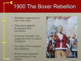 The document summarizes important events in China from 1900 to 1927. It describes the Boxer Rebellion in 1900, Sun Yatsen founding the Tongmenghui secret society in 1905 to overthrow the Qing dynasty, Puyi becoming emperor in 1908 after the death of Empress Dowager Cixi, the Wuchang Uprising in 1911 that led to the end of the Qing dynasty in 1912, Yuan Shikai becoming president and later trying to declare himself emperor from 1912 to 1916 which failed after his death, and China splitting into areas controlled by the central government, Guangdong militias loyal to Sun Yatsen, and other warlords from 1916 to 1927 during a period of warlord rule.