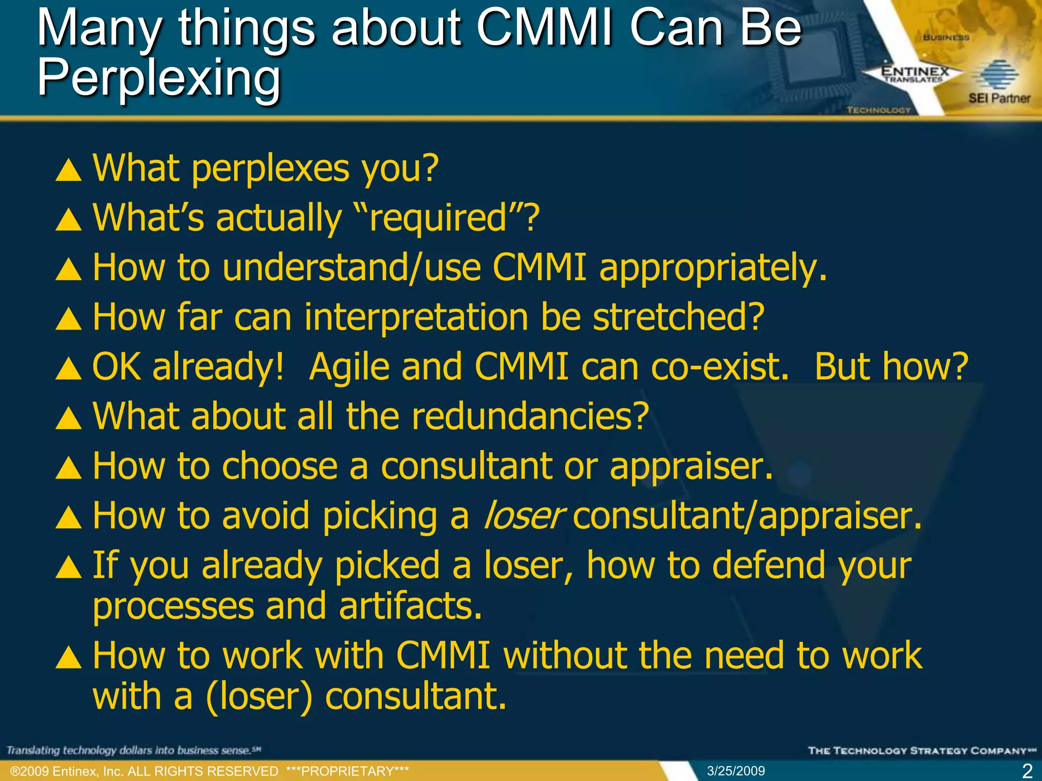The document serves as a guide to understanding and effectively using CMMI (Capability Maturity Model Integration), addressing common misconceptions and challenges professionals may face. It emphasizes the importance of understanding process areas, avoiding ineffective consultants, and integrating Agile principles with CMMI. Key recommendations include gaining expertise in relevant methodologies and focusing on business value rather than mere compliance.