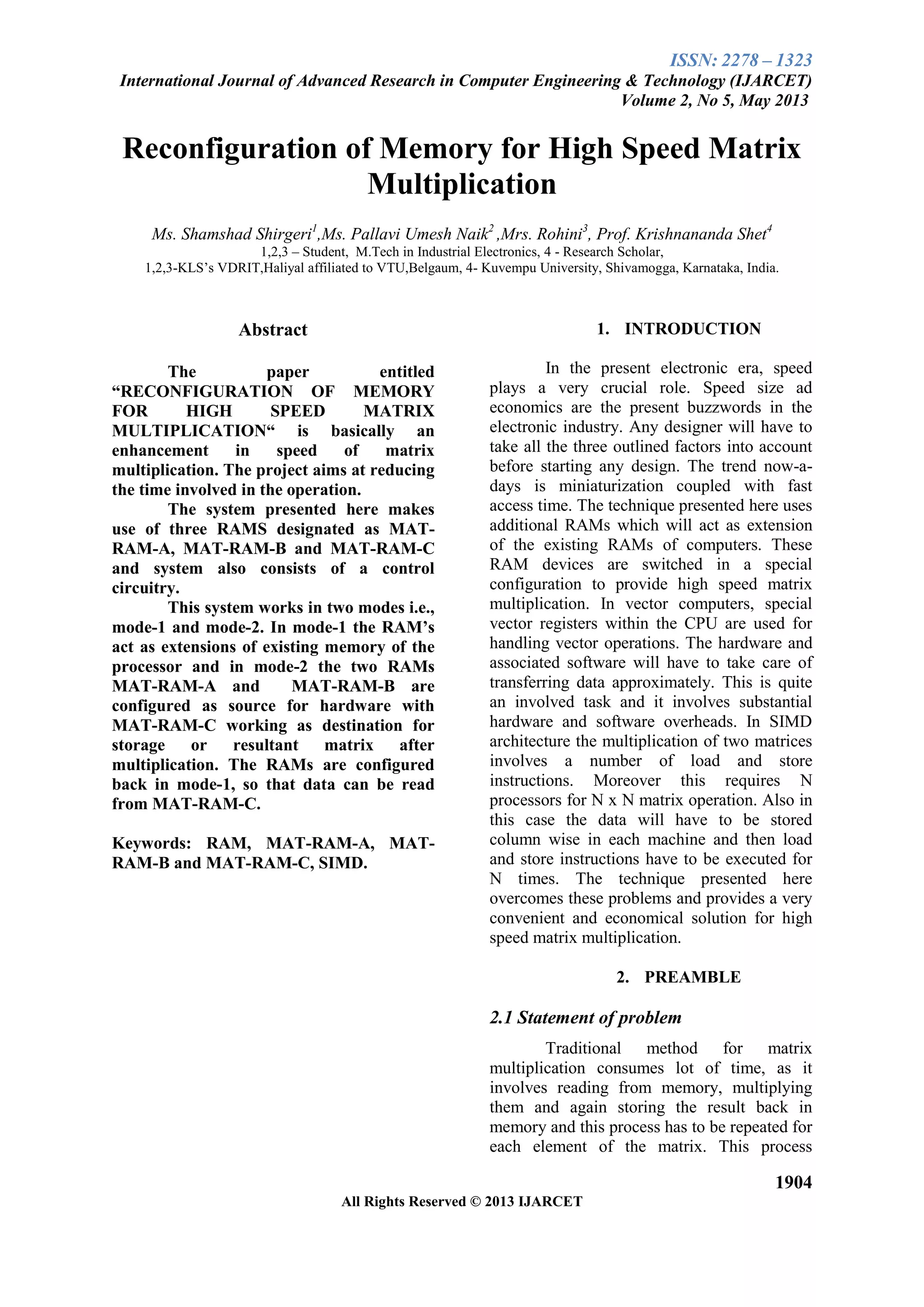 This document describes a system for reconfiguring memory to enable high-speed matrix multiplication. The system uses three RAMs (MAT-RAM-A, MAT-RAM-B, MAT-RAM-C) that can be configured in two modes: mode 1 where they act as extensions of the processor's memory, and mode 2 where MAT-RAM-A and MAT-RAM-B store input matrices and MAT-RAM-C stores the output matrix. In mode 2, an external control unit performs the multiplication and stores results directly in MAT-RAM-C, bypassing the processor to greatly increase speed compared to traditional methods. The RAMs are then switched back to mode 1 so results can be accessed normally.