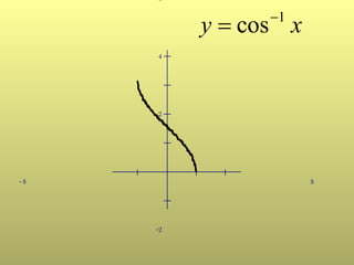 The document discusses the inverse cosine function. It is a trigonometric function that is the inverse of the cosine function, with the property that the inverse cosine of the cosine of any angle is the original angle. The inverse cosine function finds the angle whose cosine is a given number.