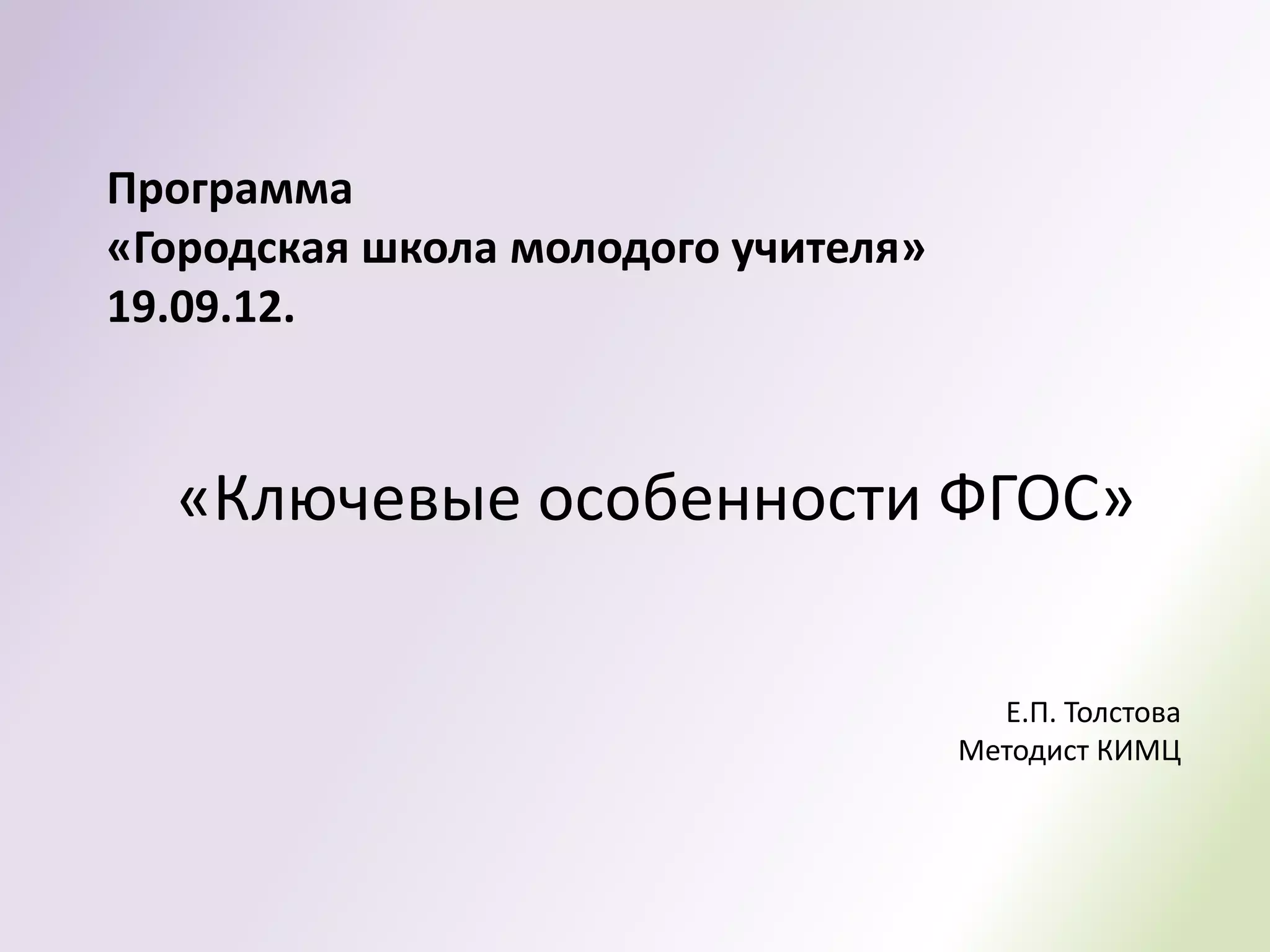 Документ описывает программу «городская школа молодого учителя», фокусируясь на основных особенностях федерального государственного образовательного стандарта (ФГОС) и изменениях в подходах к обучению. Основное внимание уделяется новому формату стандарта, который включает в себя обязательные требования и методологические обоснования, направленные на развитие личности учащихся. Также рассматриваются задачи учителя и новые образовательные результаты, включая использование деятельностного подхода и проектной работы.