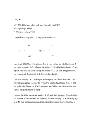 Tài liệu trình bày về khấu hao tài sản cố định, bao gồm khấu hao hữu hình và vô hình, cùng các phương pháp tính khấu hao như khấu hao tuyến tính và khấu hao nhanh. Các phương pháp này giúp doanh nghiệp thu hồi giá trị tài sản sau khi sử dụng, với mỗi phương pháp có ưu nhược điểm riêng. Ngoài ra, tài liệu cũng đề cập đến phạm vi các tài sản cần và không cần tính khấu hao.