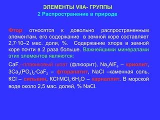 Документ содержит подробное описание элементов VI A группы (галогенов), их общую характеристику, физические и химические свойства, а также методы получения и соединения с другими элементами. Отмечаются изменения свойств галогенов по мере перехода от фтора к астату, а также их распространение в природе и реакционная способность. Документ также касается комплексных галогенидов и взаимодействий галогенов с водой и другими веществами.