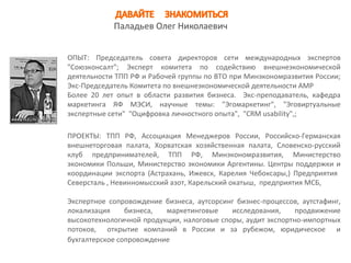 Документ описывает семинар по повышению квалификации экспортно-ориентированных субъектов малого и среднего предпринимательства в Чувашии, организованный Олегом Паладьевым, который имеет более 20 лет опыта в области внешнеэкономической деятельности. Основное внимание уделяется изучению возможностей глобальных рынков и вопросам юридической и финансовой защиты бизнеса. Документ также содержит информацию о поддержке экспортной деятельности и участие в международных мероприятиях.