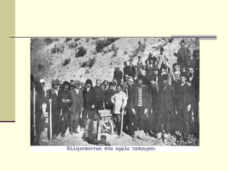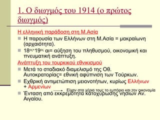 1. Ο διωγμόςτου 1914 (ο πρώτος διωγμός) Η ελληνική παράδοση στη Μ.Ασία Η παρουσία των Ελλήνων στη Μ.Ασία = μακραίωνη (αρχαιότητα). 18 ος+ 19 ος αι= αύξηση του πληθυσμού, οικονομική και πνευματική ανάπτυξη. Ανάπτυξη του τουρκικού εθνικισμού Μετά το σταδιακό διαμελισμό της Οθ. Αυτοκρατορίας= εθνική αφύπνιση των Τούρκων. Εχθρική αντιμετώπιση μειονοτήτων, κυρίως Ελλήνων + Αρμενίων Ένταση από εκκρεμότητα κατοχύρωσης νησιών Αν. Αιγαίου. Είχαν στα χέρια τους το εμπόριο και την οικονομία