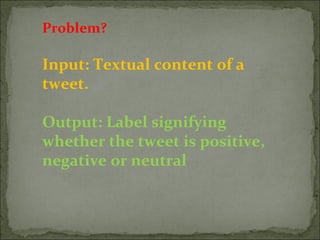 The document details a project focused on classifying tweets as positive, negative, or neutral using a linear SVM classifier. A total of 9684 tweets were analyzed, resulting in 7875 training tweets and 8011 test tweets after preprocessing. The final model achieved an accuracy of 64% on the test set with an F-measure of 0.6163.