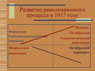 Документ описывает этапы революционного кризиса в России в 1917 году, включая февральскую и октябрьскую революции, а также составы временного правительства. Он анализирует политический спектр, ключевых лидеров и их программы, обстоятельства правительственных кризисов и изменения в коалиционных правительствах. В документе также представлены взгляды и мнения иностранных наблюдателей о российской политической ситуации того времени.